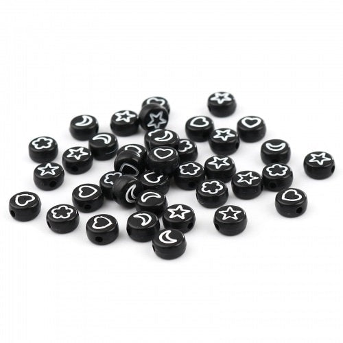 Galaxy bead lot, moon and star beads, black Acrylic and white pattern, fits 7mm alphabet beads