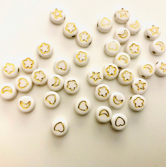 Galaxy white and gold bead lot symbol beads Beads Round white Acrylic Choose your pack size assorted moon star heart beads outlines