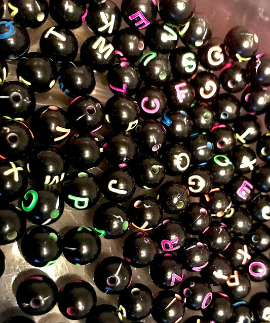 Round ball alpabet bead, black with colored letter beads, 8mm acrylic letter beads, assorted color letters