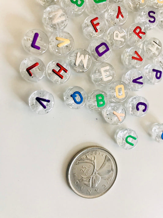 Big alphabet beads, clear with glitter 10mm assorted letters large bracelet beads