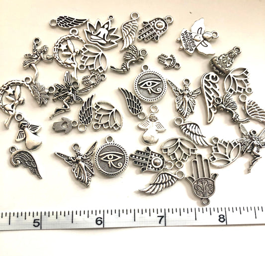 Fairy charm mix, spiritual charms, fairy and angel with evil eyes, hamsa and lotus flower charms