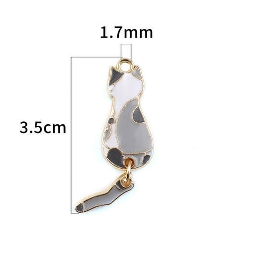 Black and white cat with moveable tail dangle charm , enamel cat white with black spots with gold plated back