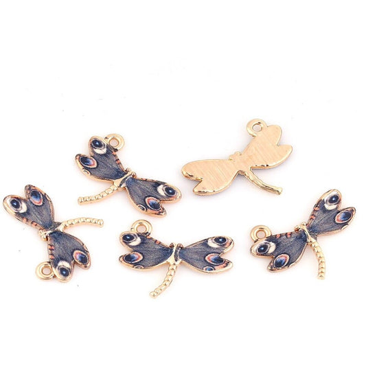 Dragonfly charms, gray enamel with black dots dragonflies with gold plated back