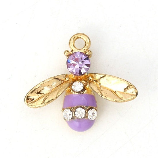 Gold bee charm, rhinesone and enamel bee, assorted colors available with gold wings