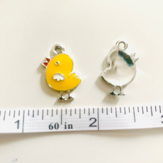 Chick charms, white enamel bird, pendant charm silver back, farm animal