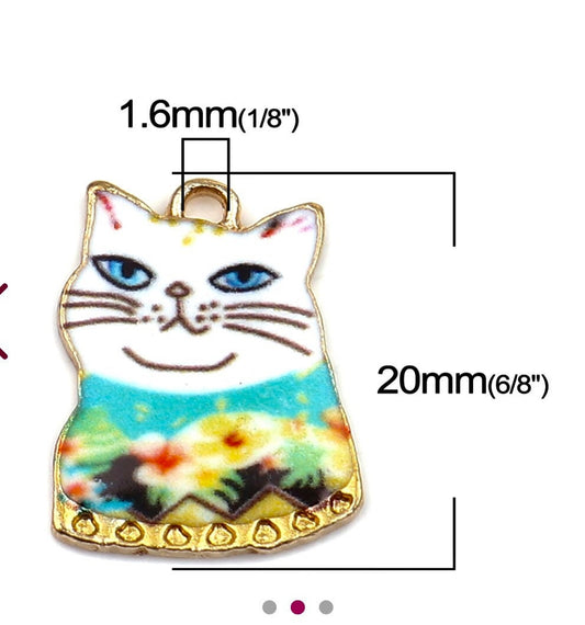 White cat charm, cat with hawaiian shirt, whimsical summer cat charm, gold backed charm