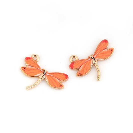 Dragonfly charms, orange patterned enamel dragonflies with gold plated back