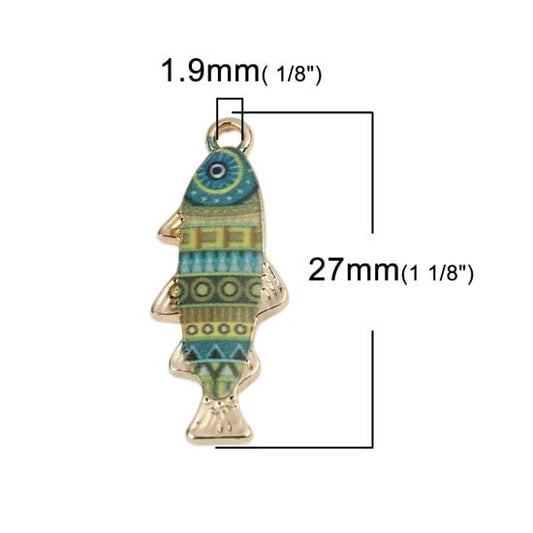 Fish charm, enamel patterned fish, blue and green design gold plated charm for pendants or bracelets fishing charm