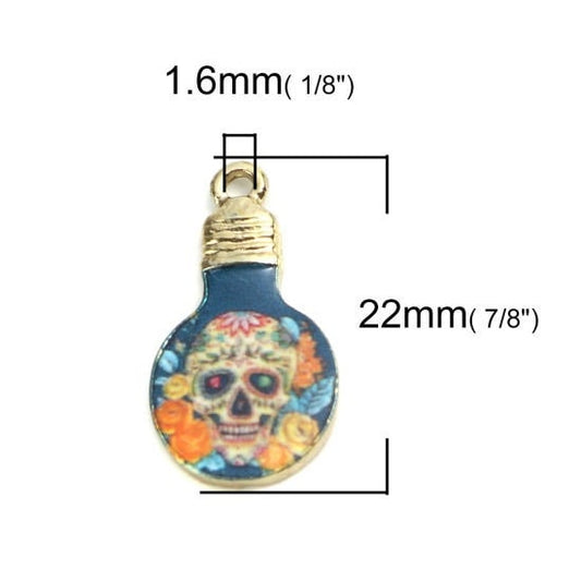 Skull light bulb charm, blue enamel with flowers gold plated charm charm