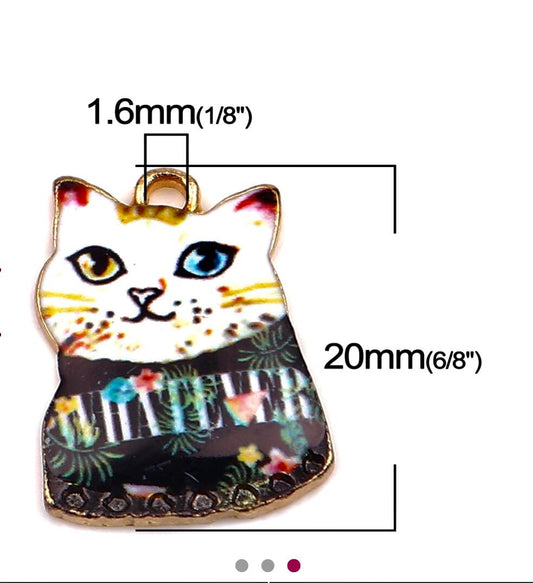 white cat charm, enamel cat with black whatever shirt, whimsical cat , gold backed charm
