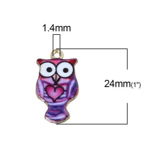 Owl charm, purple enamel with pink heart, bird with heart , pendant and bracelet charm