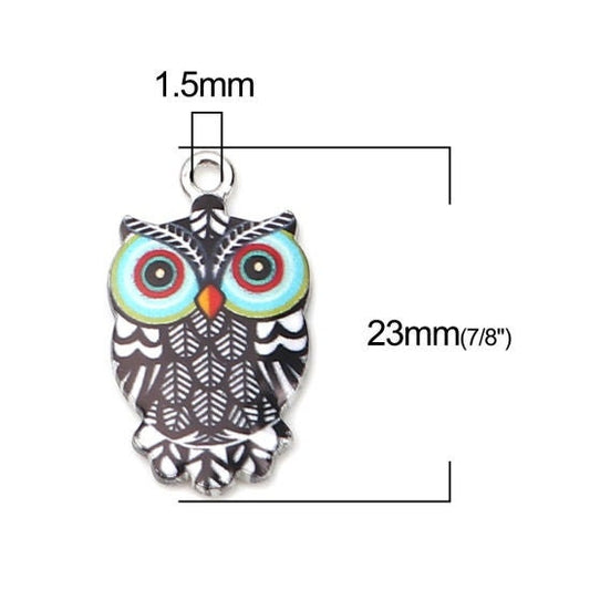 Owl charm, enamel patterned bird, black with blue and red eyes, silver metal charm , bracelet and pendant charm