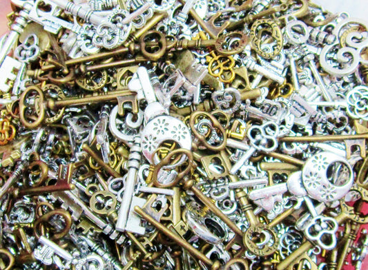 Key Charms, fancy assorted keys in brass, silver and gold tones bulk mix