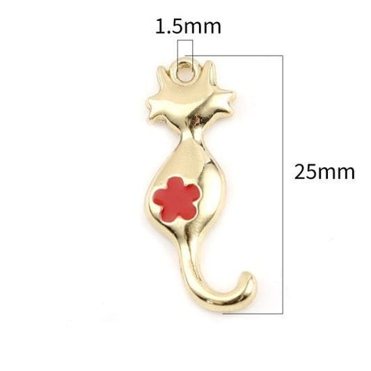 Gold cat charm, gold plated charm with red flower on cat butt curved tail charm