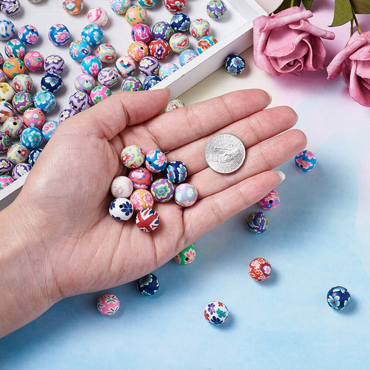 Polymer clay flowered 10mm bead, mixed colors, floral patterned assorted colors style bead mix