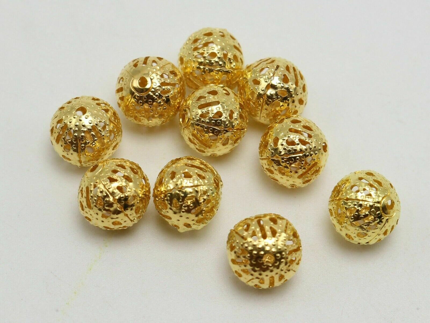 Gold filigree beads, 10mm hollow metal spacer bead lightweight scroll pattern
